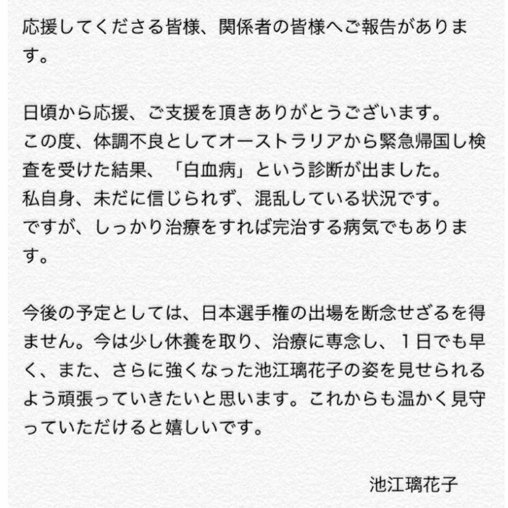 競泳の池江璃花子選手が白血病を公表したツイッターのメッセージです。 #池江璃花子